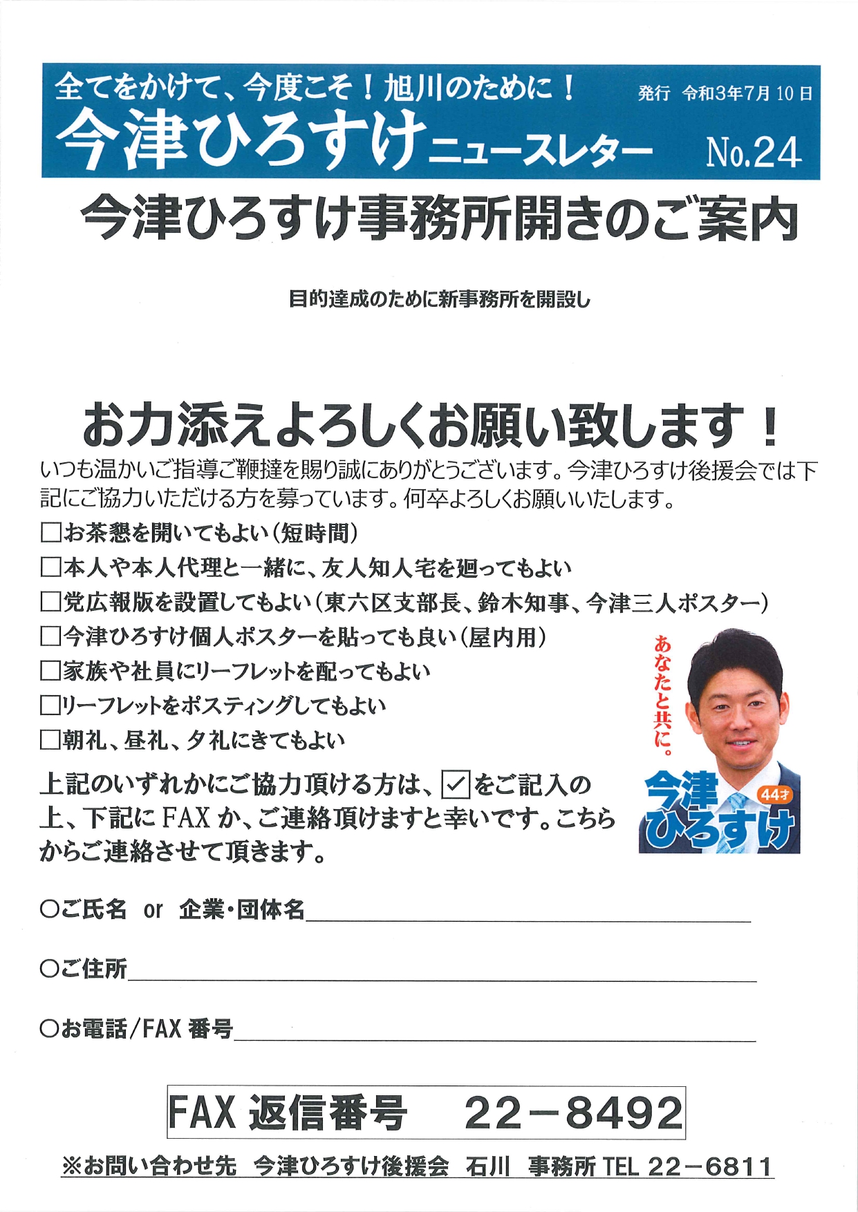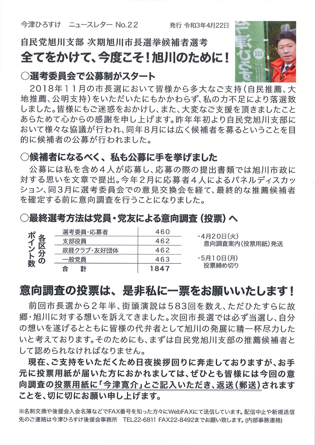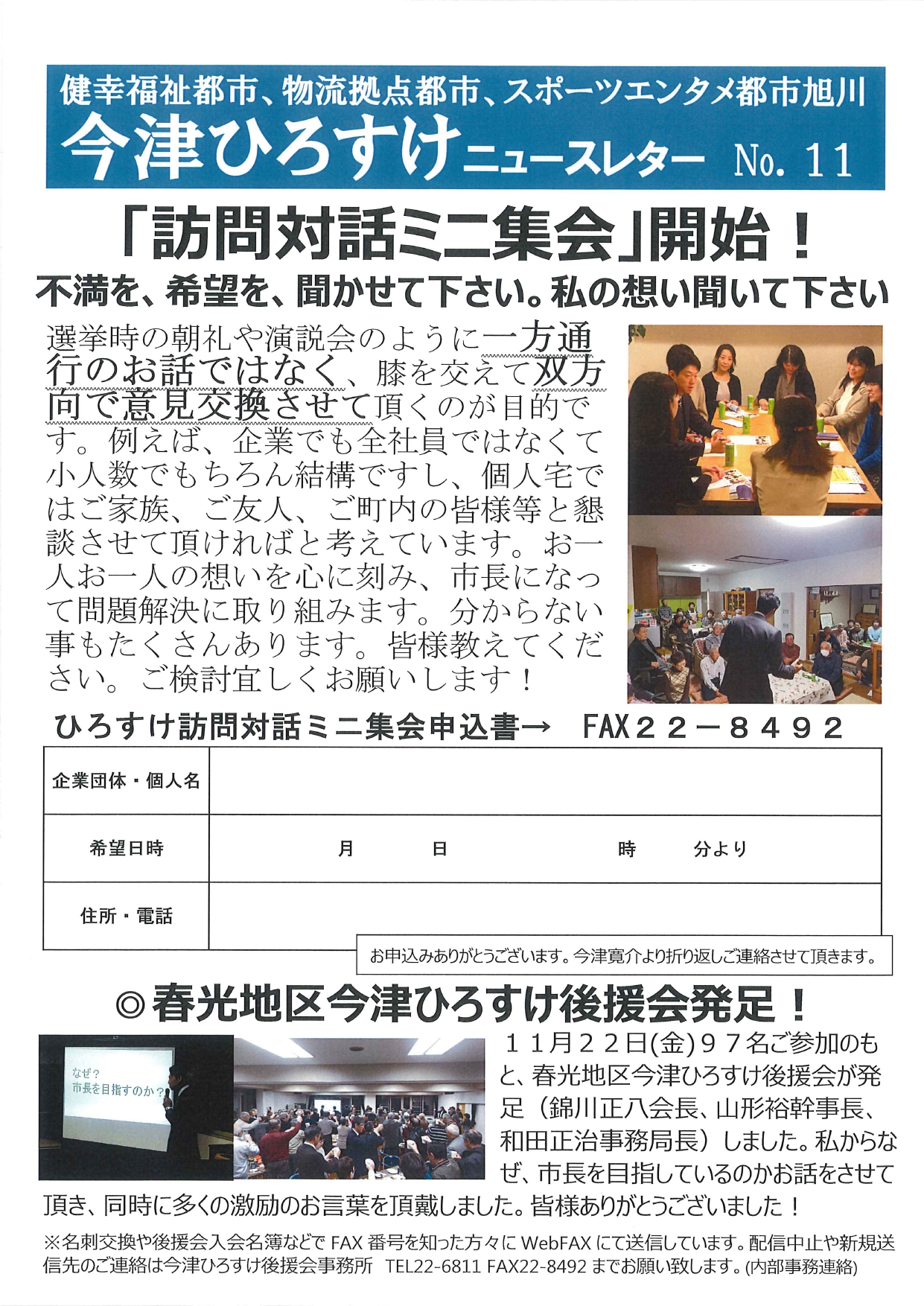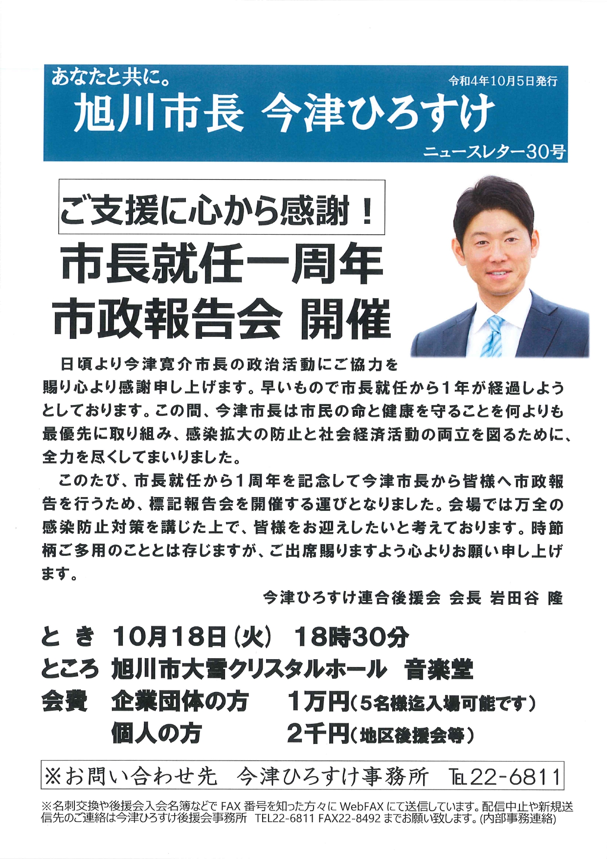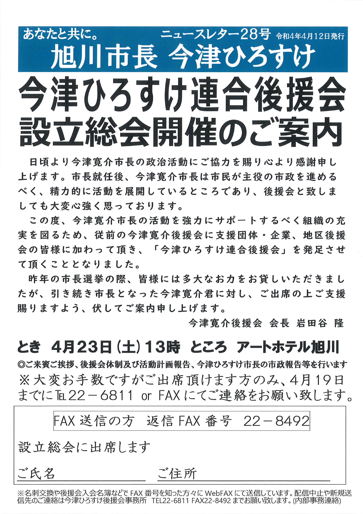 - 今、皆で心ひとつに、市長選落選から2年、旭川を今一度、洗濯いたし申し候