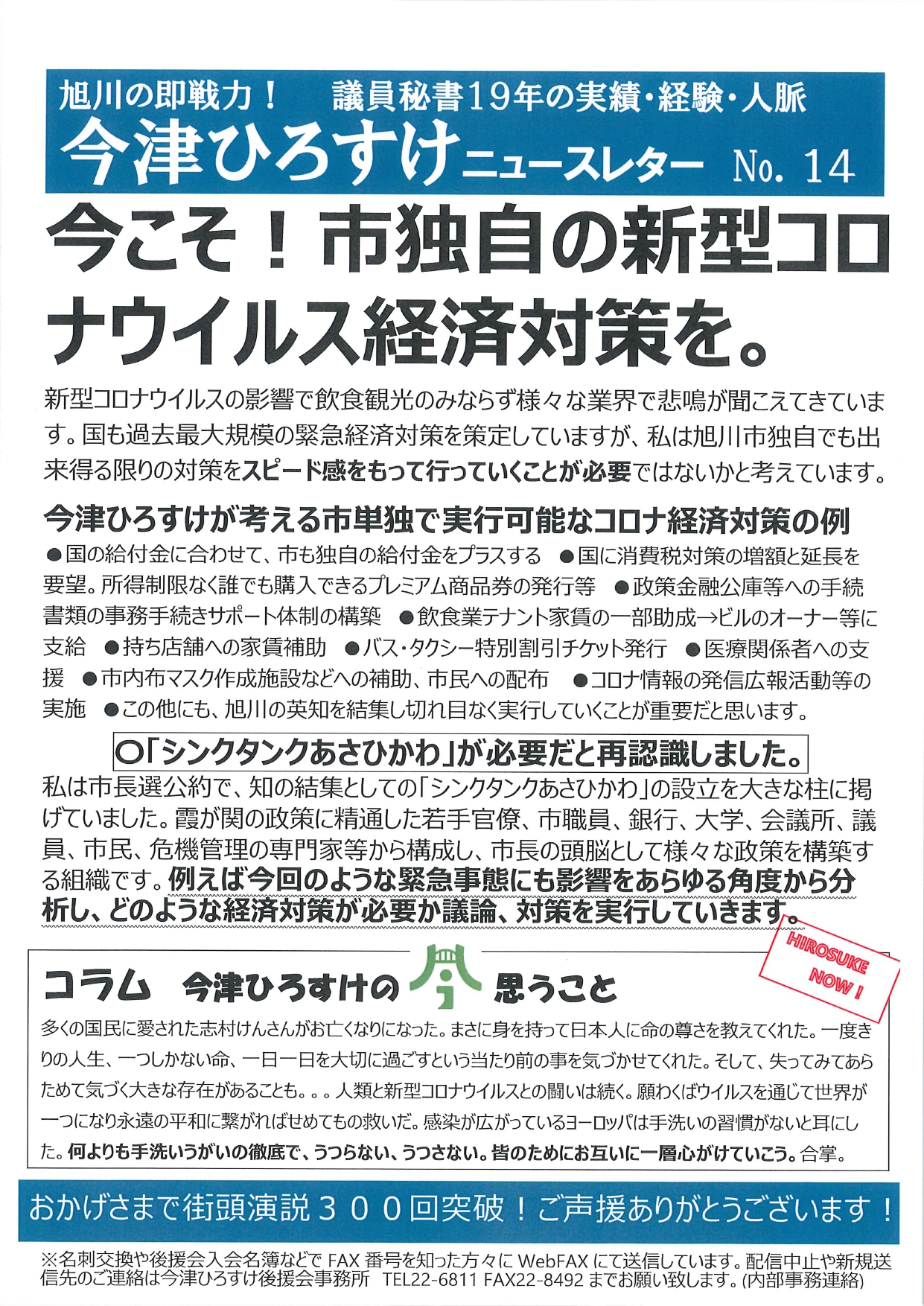 - スピード感を持った市独自のコロナ経済対策を、シンクタンクあさひかわが必要、コラム今思うこと志村けんさんの死を悼む
