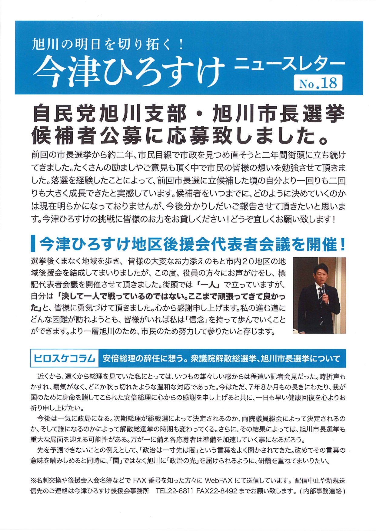 - 自民党旭川支部市長選候補者公募に応募、地区後援会代表者会議開催、コラム「安部総理の辞任に想う」