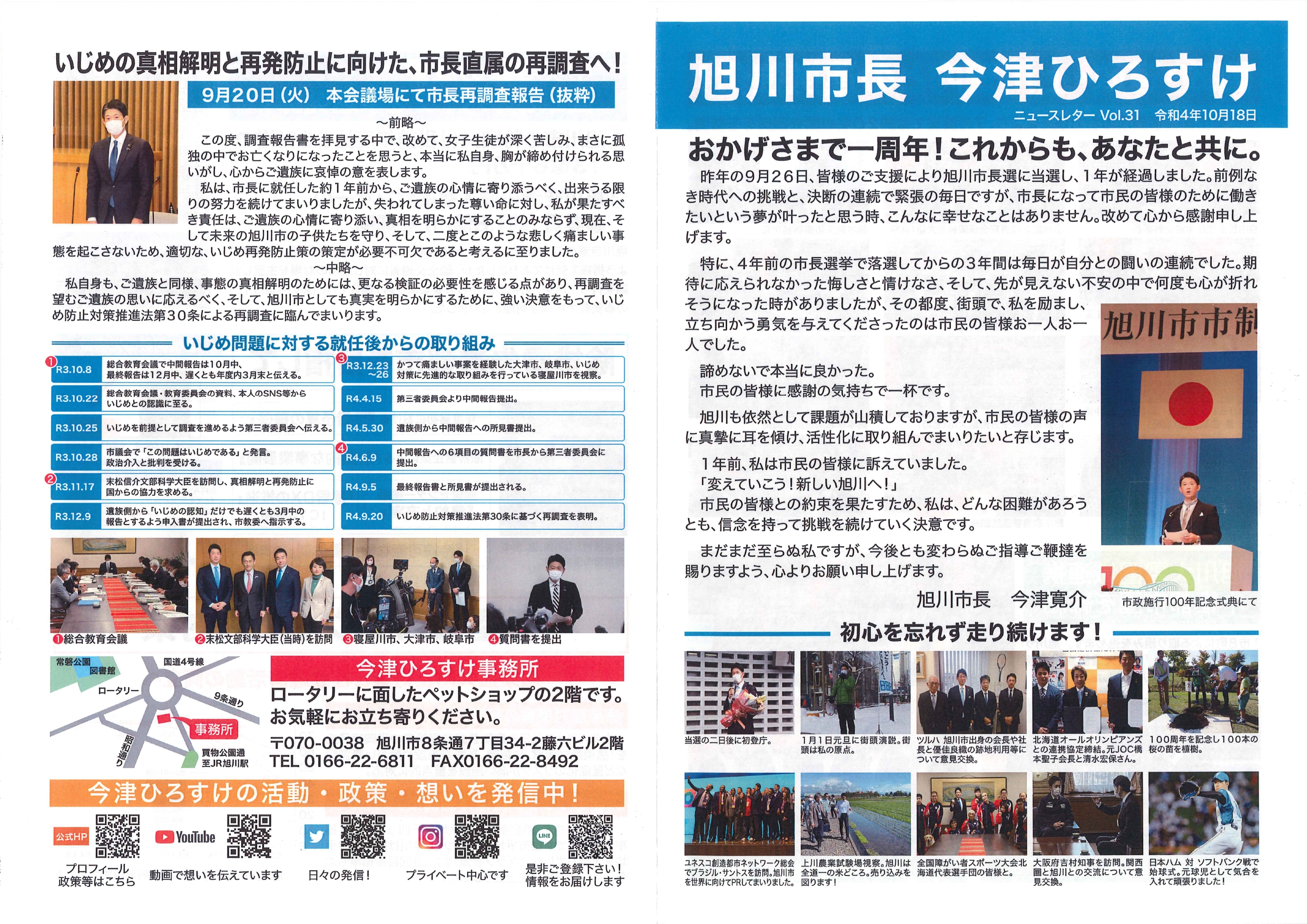 - おかげさまで市長就任1周年、いじめ再調査、真相解明と再発防止