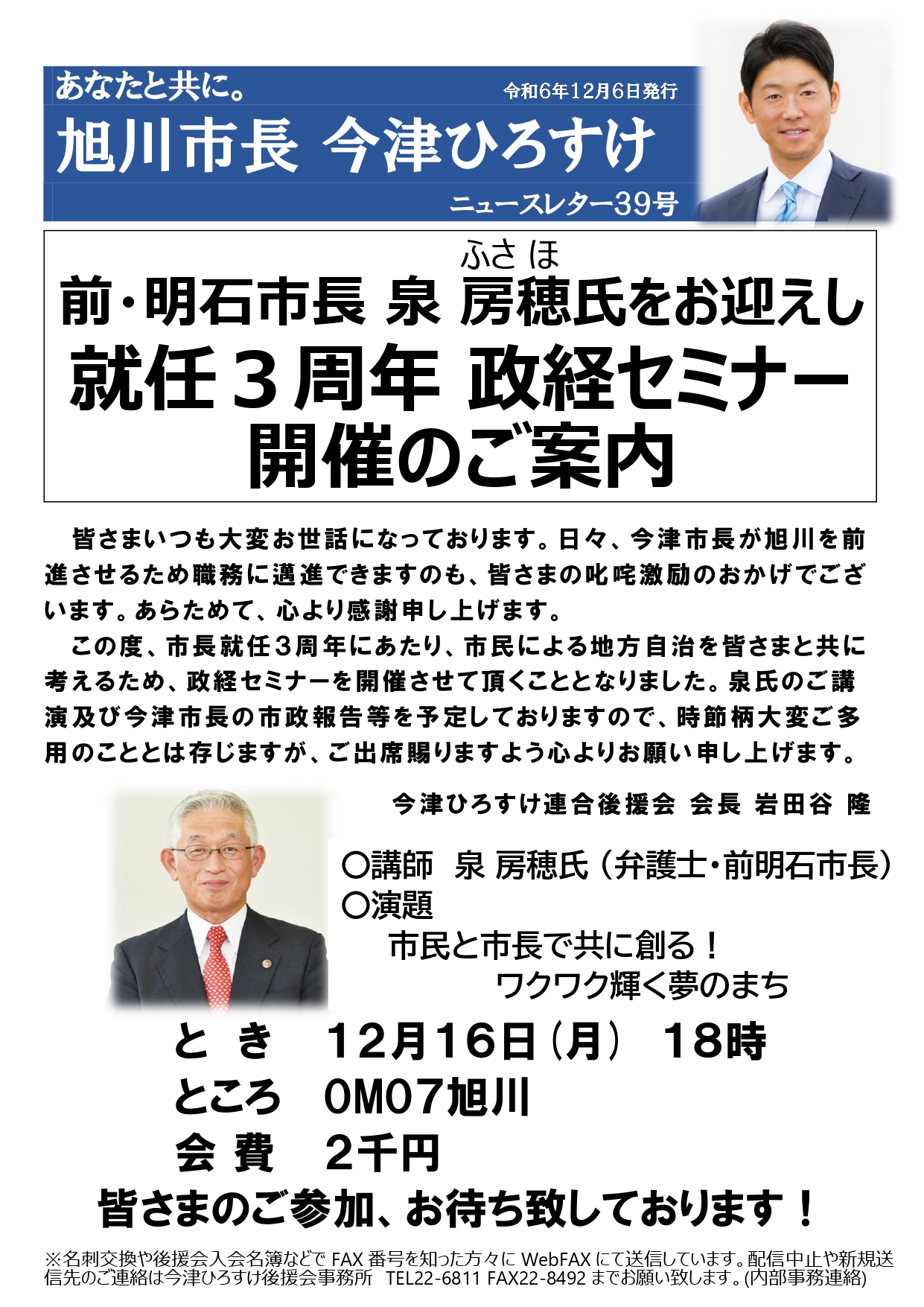 - 前明石市長泉房穂氏をお迎えし就任3周年政経セミナー開催案内